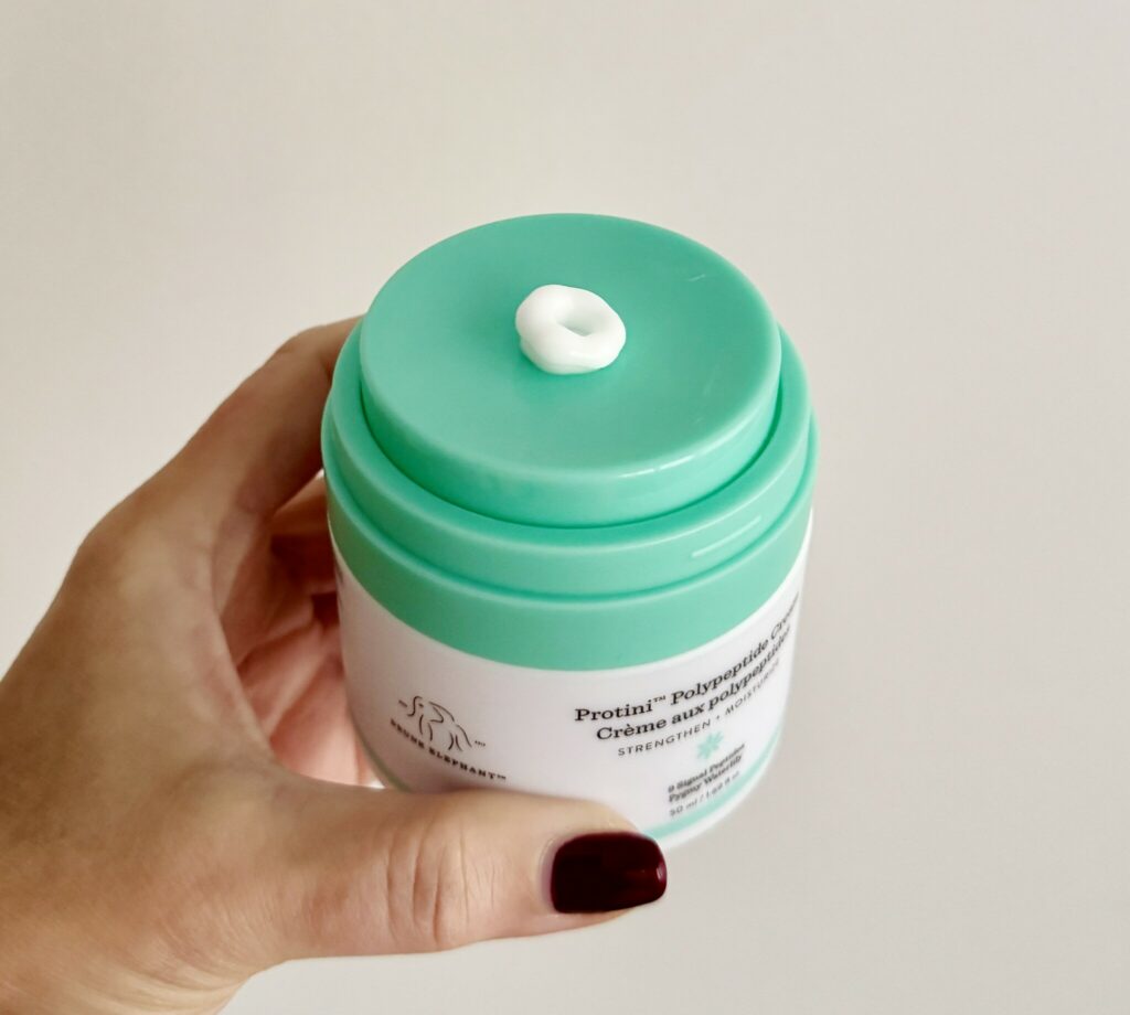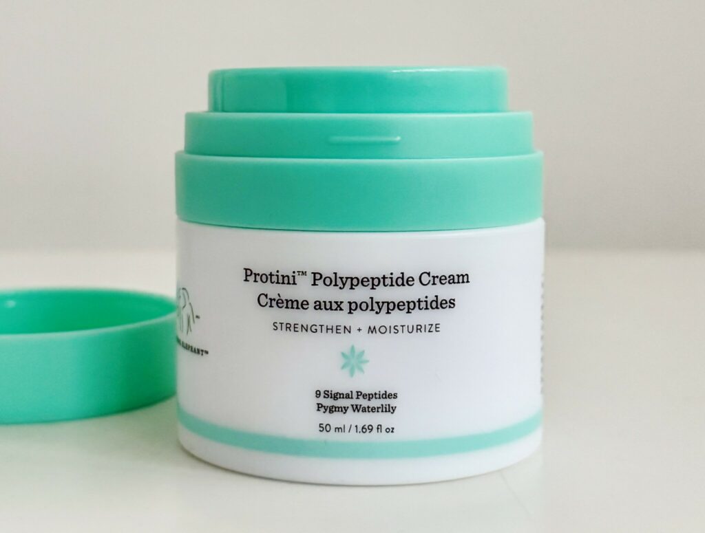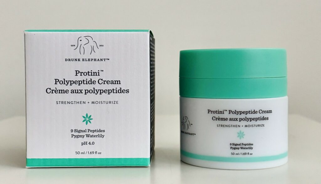 Därför har jag plockat fram en peptidktäm, Drunk Elephant Protini Polypeptide Cream. Peptider ska kunna öka produktionen av kollagen och elastin, så att huden blir starkare och fastare. Det behövs i detta väder.