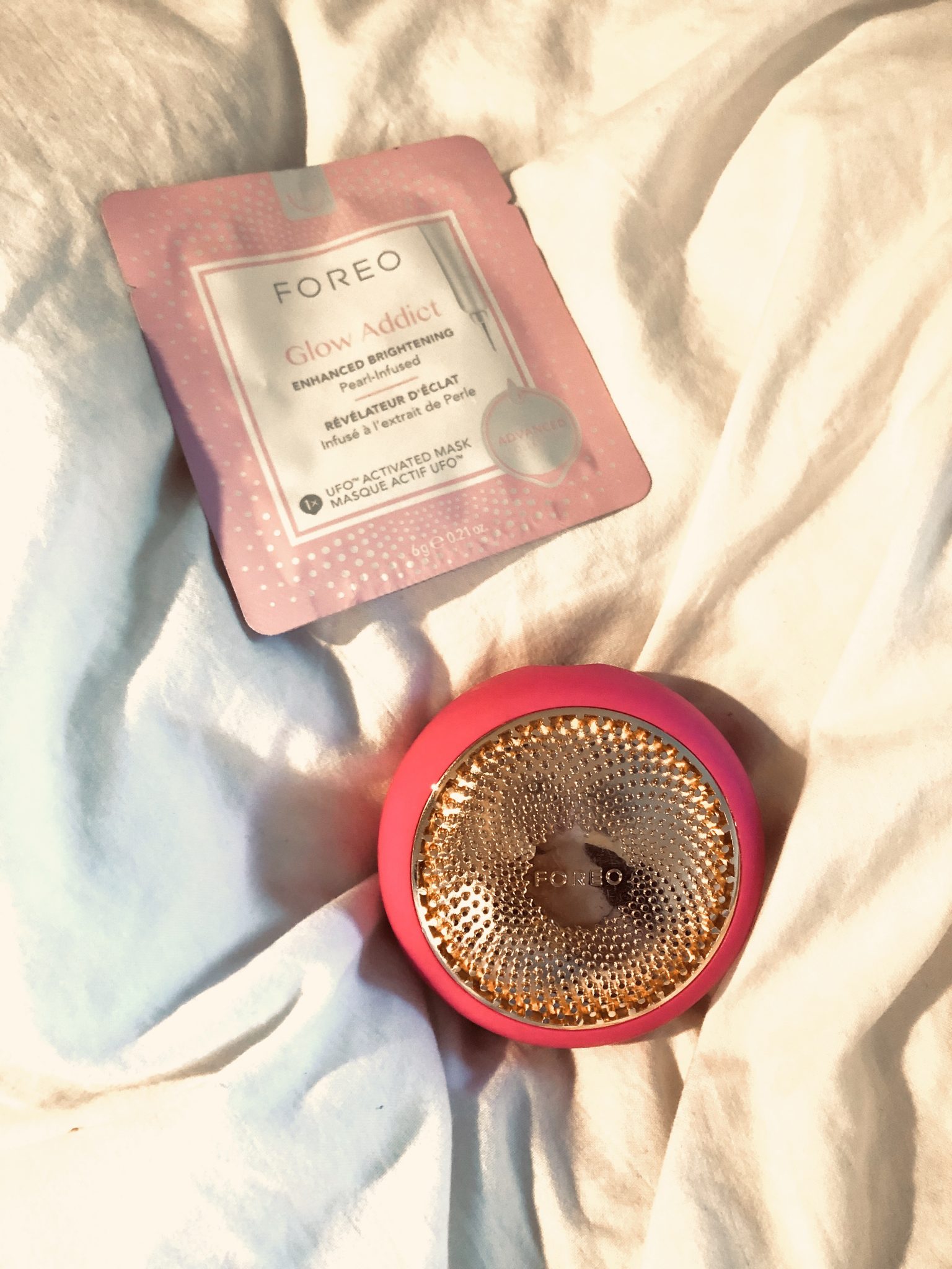 Foreo Ufo med masken GLOW addict. Denna ger verkligen ett instant GLOW men den innehåller också gosigt glycerin och andra härligs ingredienser som ger mycket fukt.